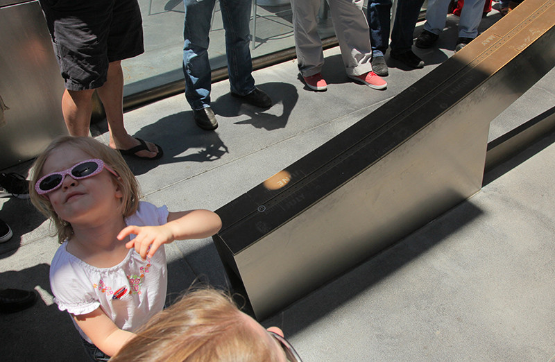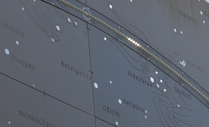 As the spot strikes the arc's center line (at noon), LEDs will be activated on the sky chart revealing the sun's current position at the sky.