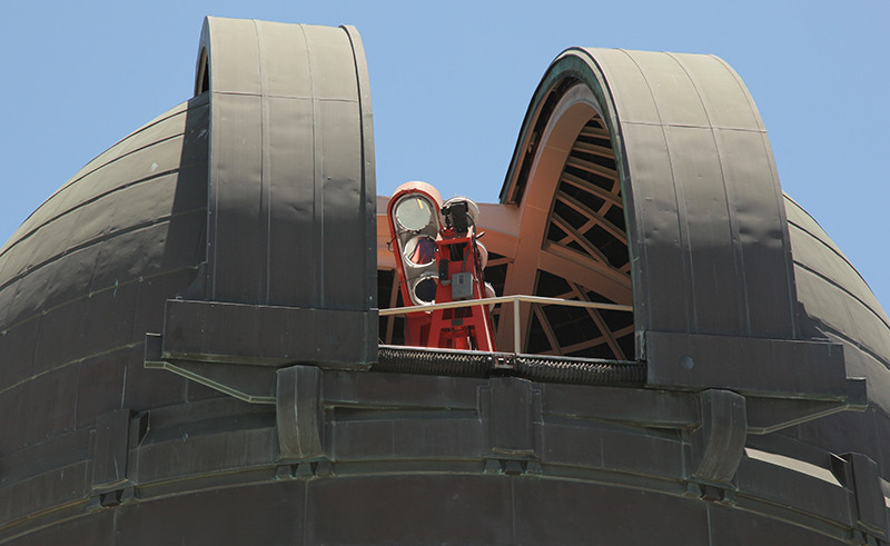 The sun shines through a lens and projects a spot onto the meridian arc.
