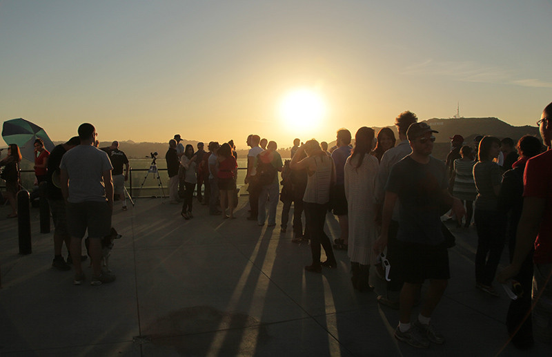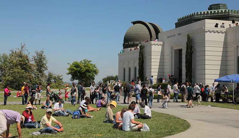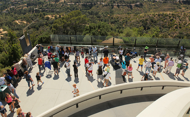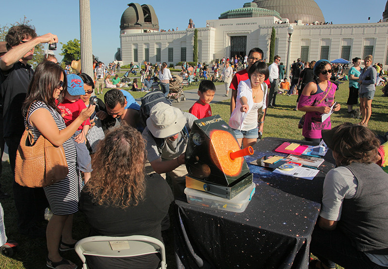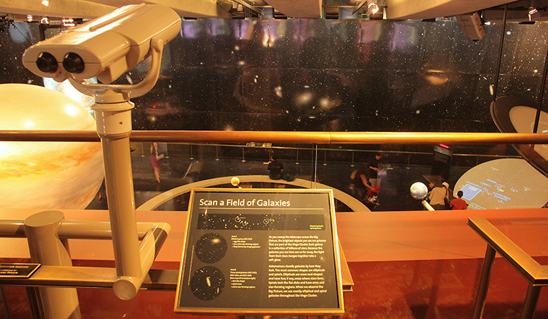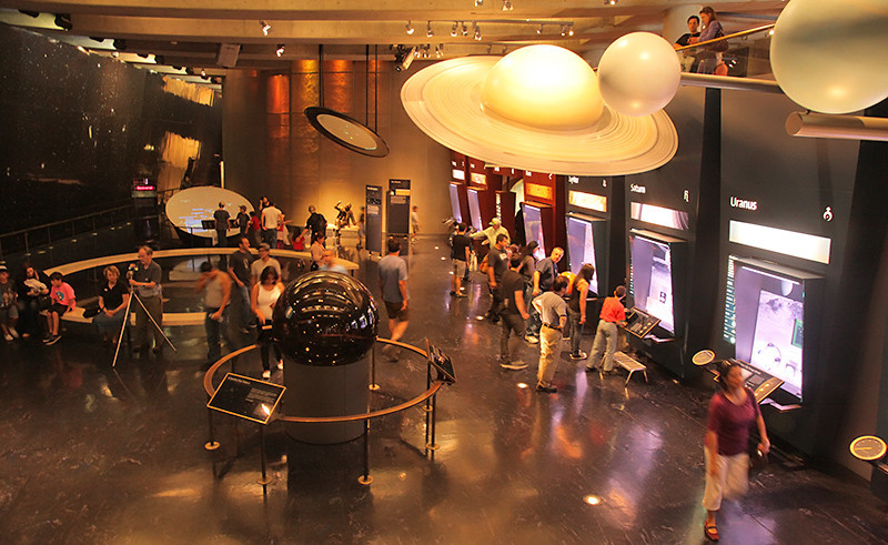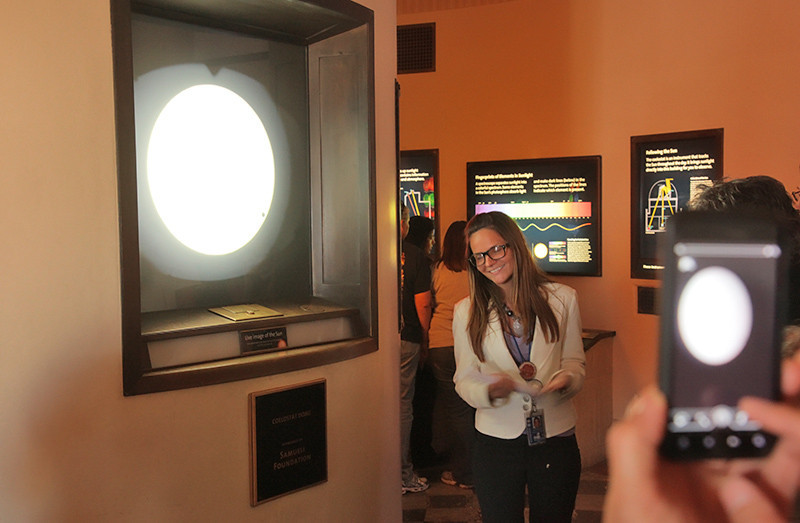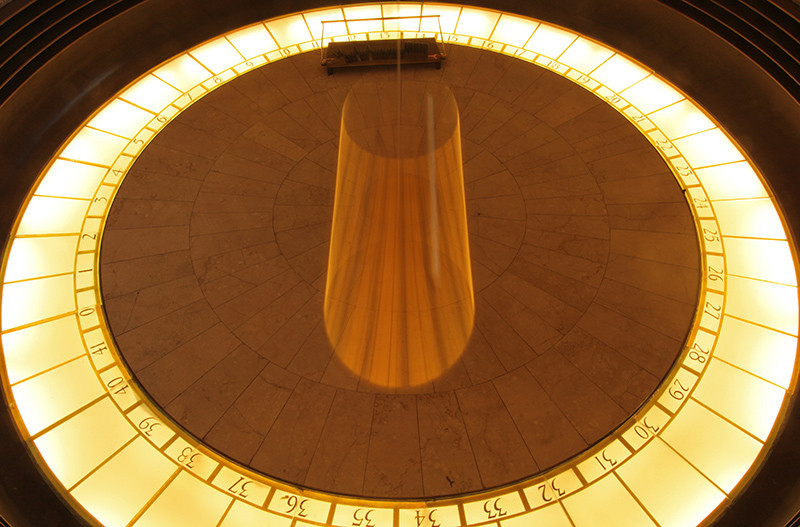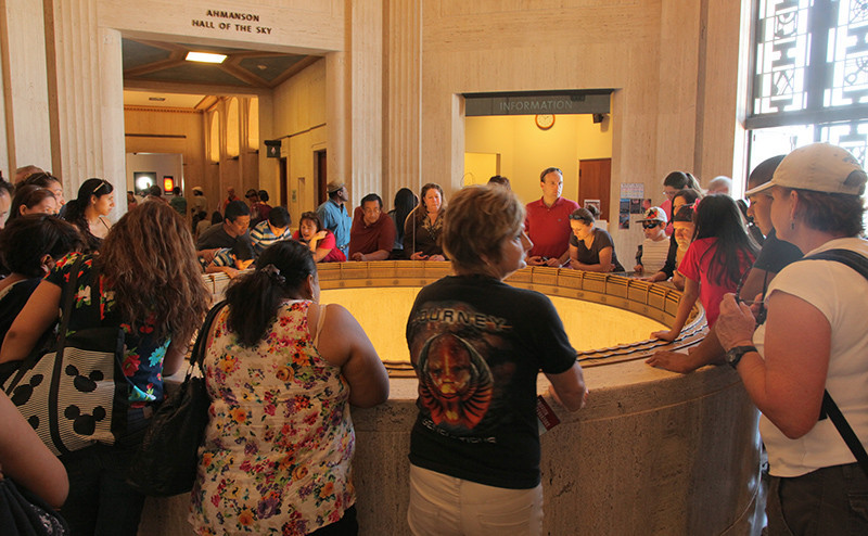 Visitors gather around the Foucault Pendulum rotunda showing earth's rotation.