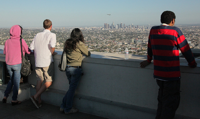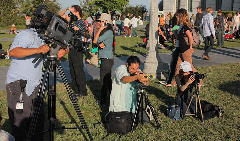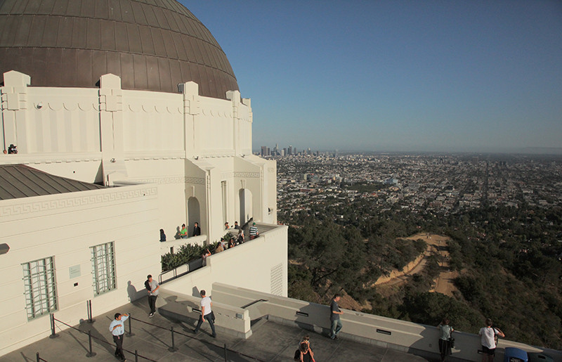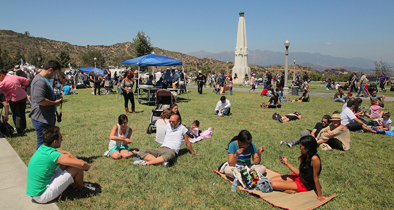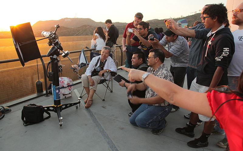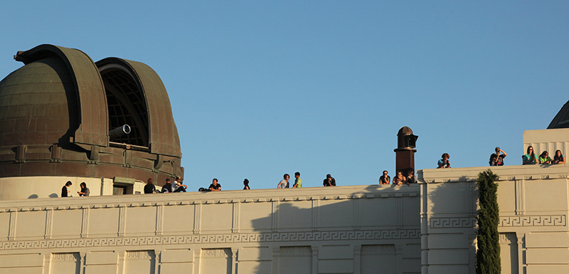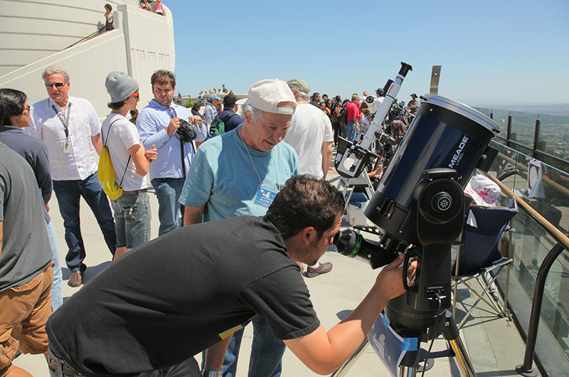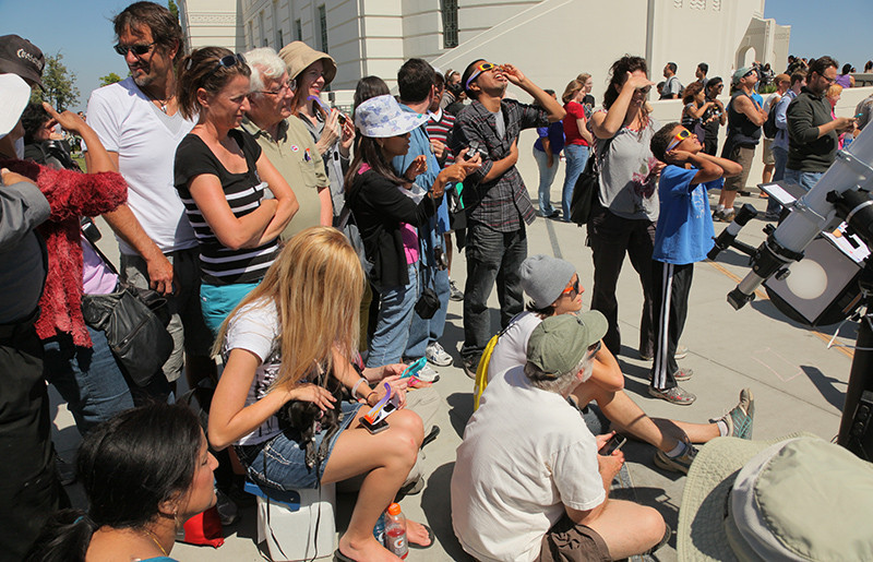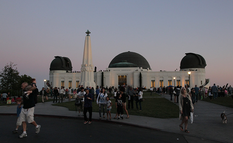 Visitors gather around the Foucault Pendulum rotunda showing earth's rotation.