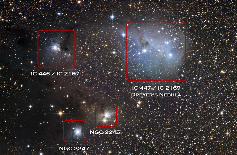 IC 447 (IC 2169), IC 446 (IC 2167), NGC 2245, NCG 2247